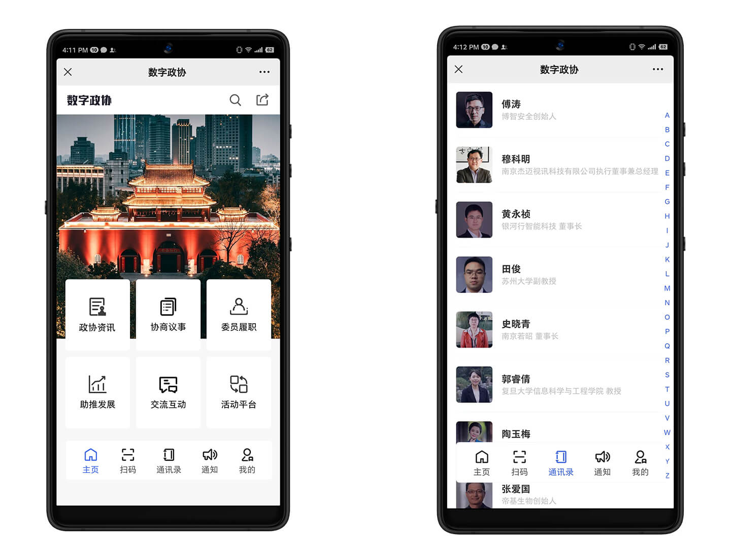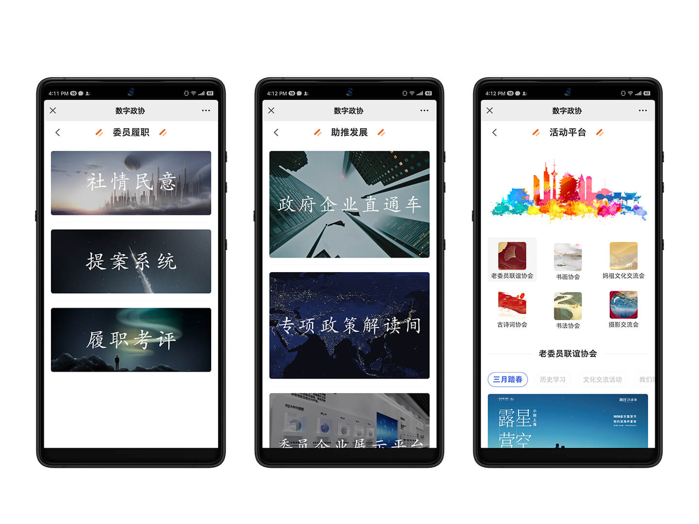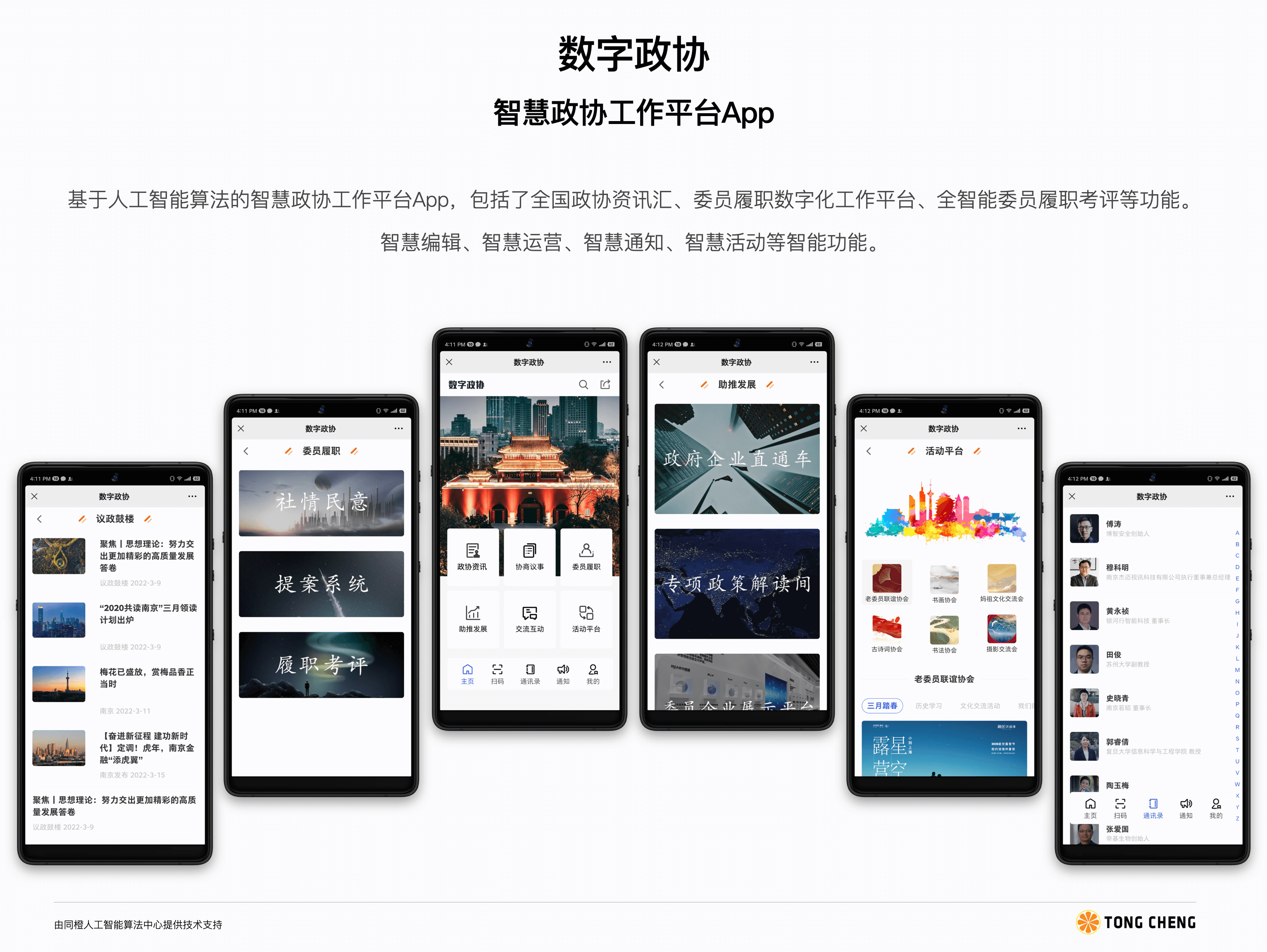 基于人工智能算法的智慧政协工作平台App,包括了全国政协资讯汇、委员履职数字化工作平台、全智能委员履职考评等功能。智慧编辑、智慧运营、智慧通知、智慧活动等智能功能。